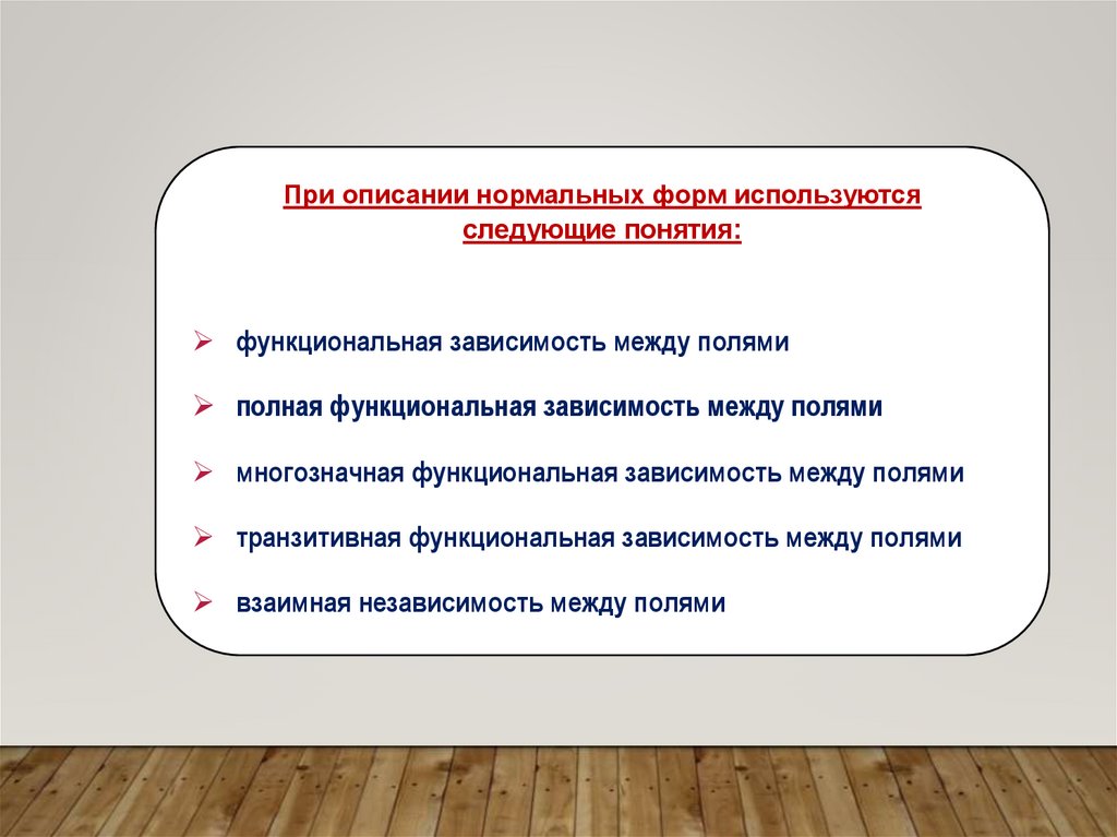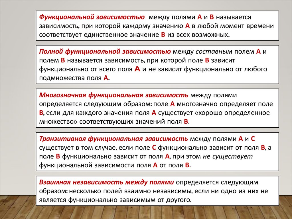 Функциональной зависимостью между полями А и В называетсязависимость, при которой каждому значению А в любой момент времени