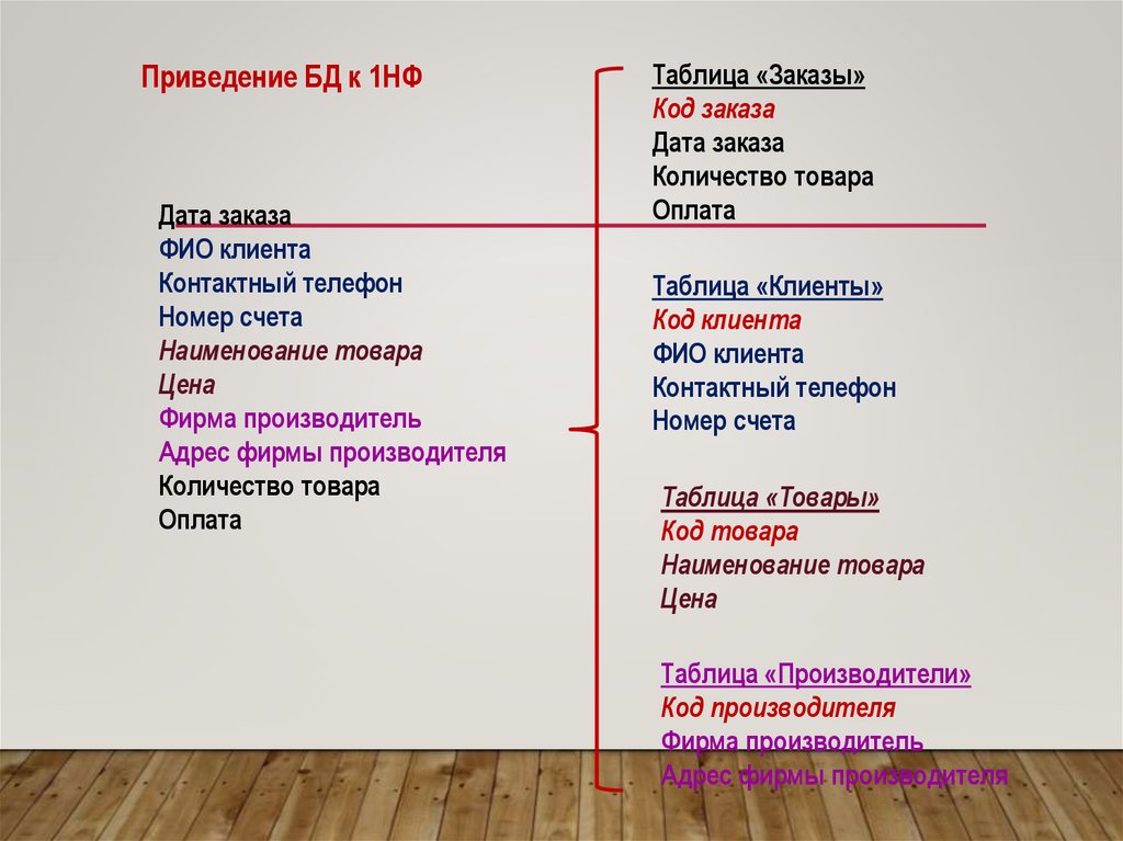 НЕОБХОДИМО ПОСЛЕДОВАТЕЛЬНО ПРИВЕСТИ ЕЁ К 1НФ, 2НФ И 3НФ.