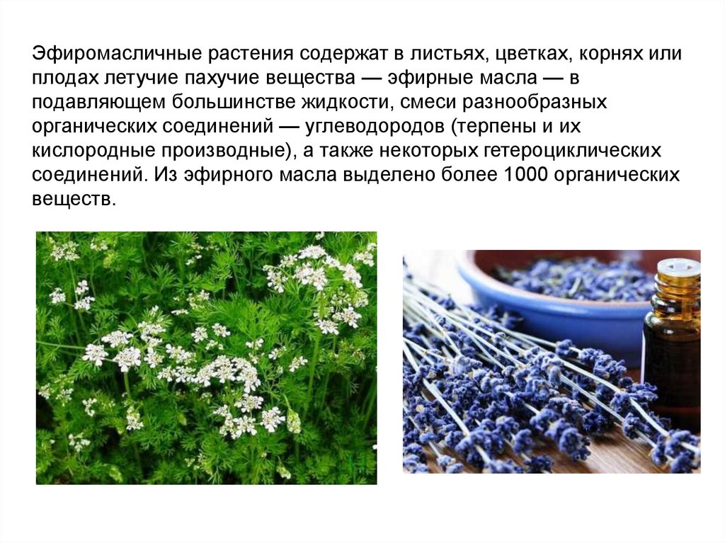 Эфиромасличные растения содержат в листьях, цветках, корнях илиплодах летучие пахучие вещества — эфирные масла — в