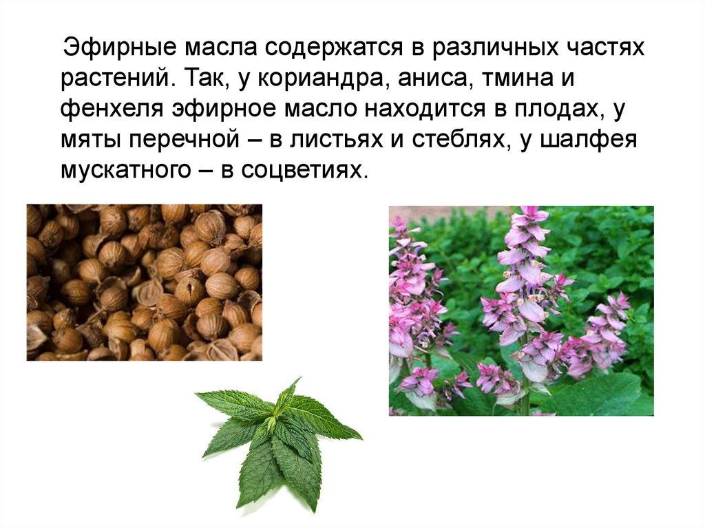 Эфирные масла содержатся в различных частяхрастений. Так, у кориандра, аниса, тмина и