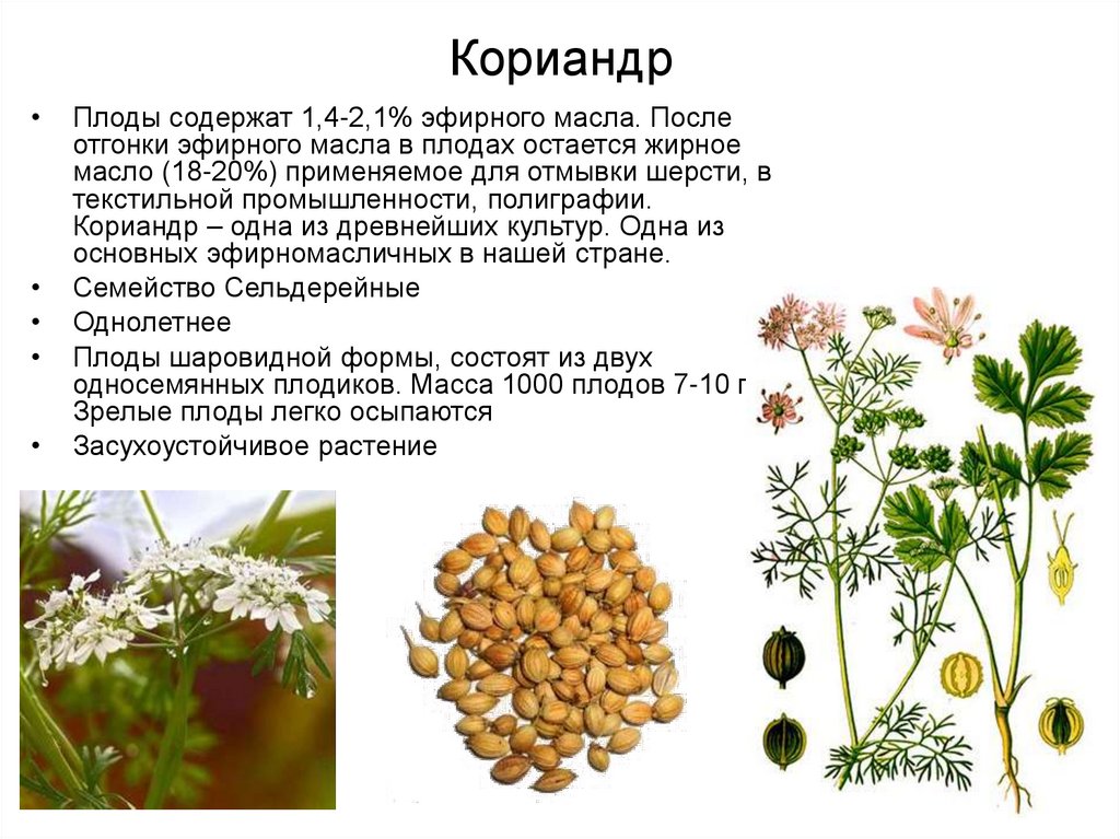 КориандрПлоды содержат 1,4-2,1% эфирного масла. После