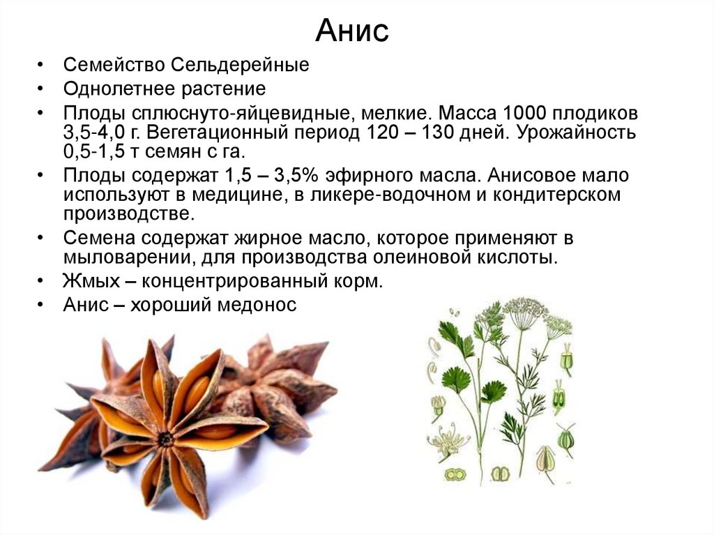 • Плоды содержат 1,5 – 3,5% эфирного масла. Анисовое мало
