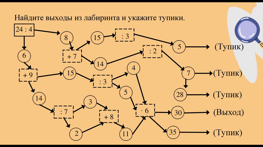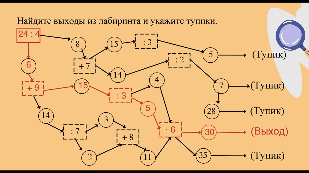 Найдите выходы из лабиринта и укажите тупики.24 : 4