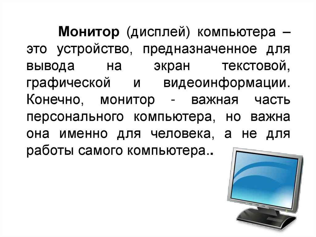Монитор (дисплей) компьютера –это устройство, предназначенное для