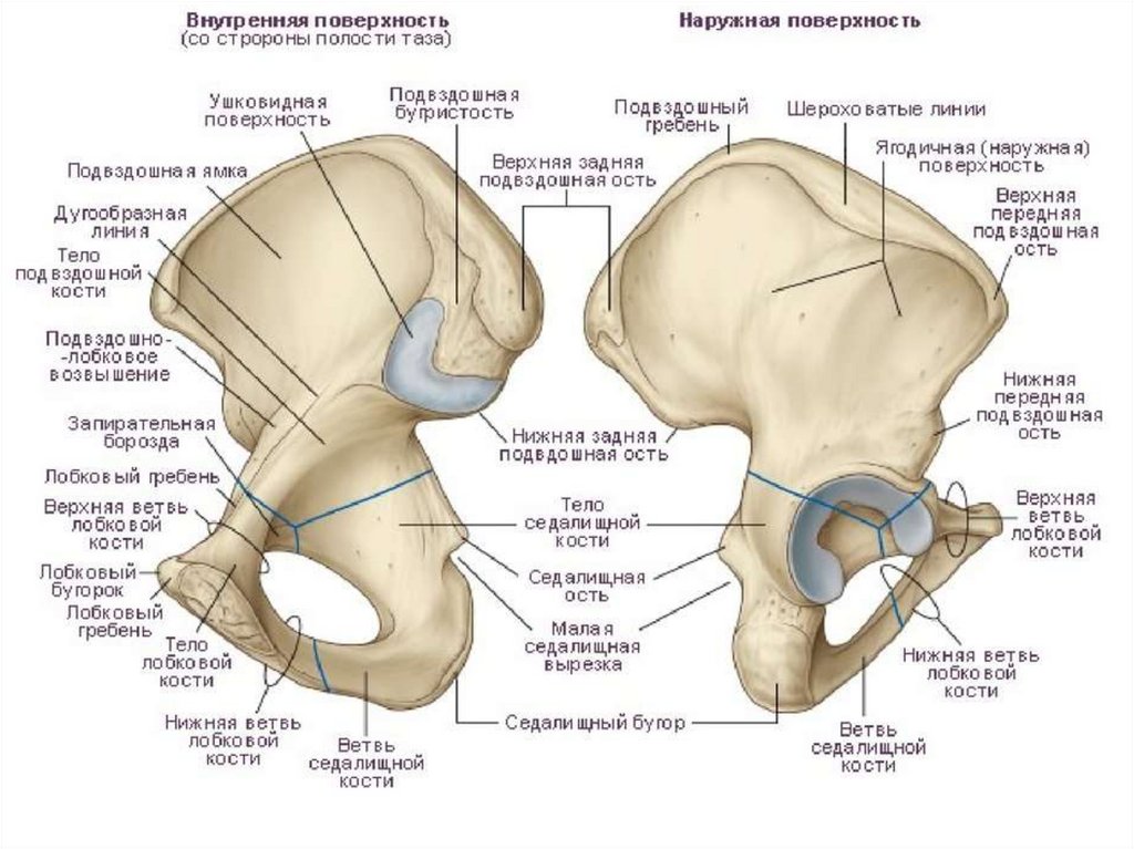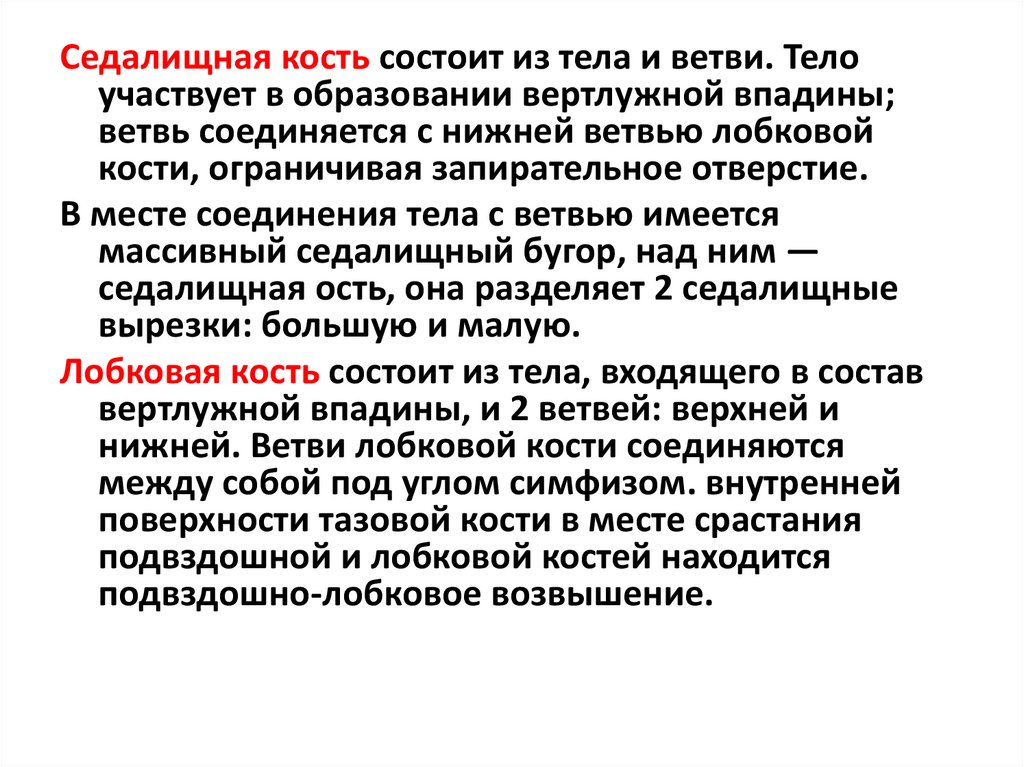 Седалищная кость состоит из тела и ветви. Телоучаствует в образовании вертлужной впадины;
