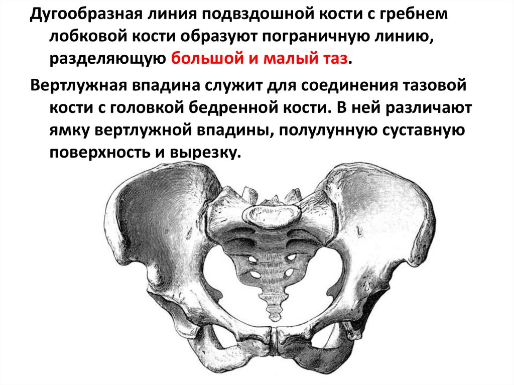 Дугообразная линия подвздошной кости с гребнемлобковой кости образуют пограничную линию,