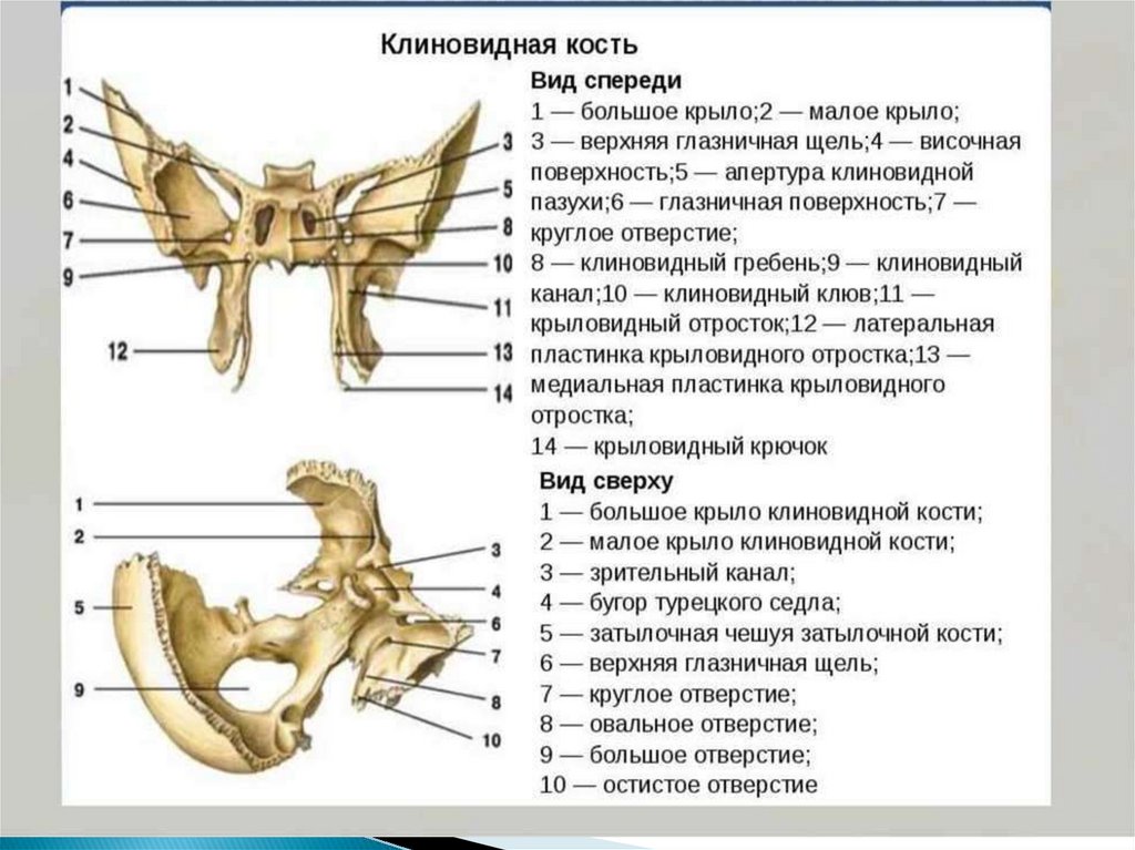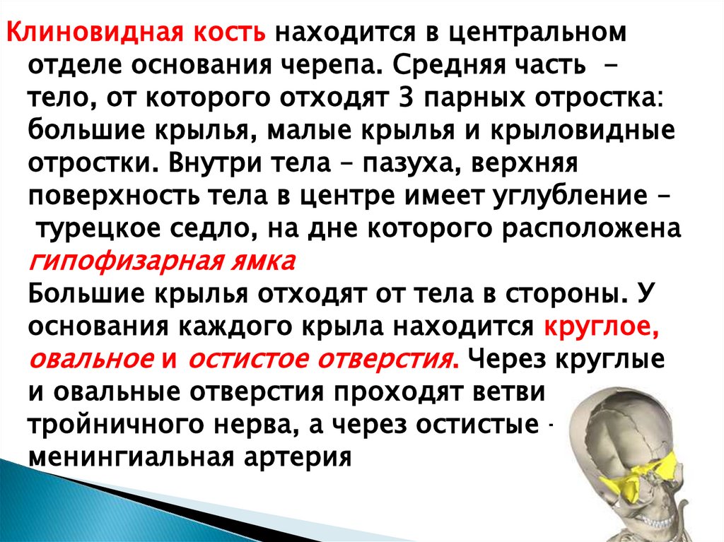 Клиновидная кость находится в центральномотделе основания черепа. Средняя часть тело, от которого отходят 3 парных отростка: