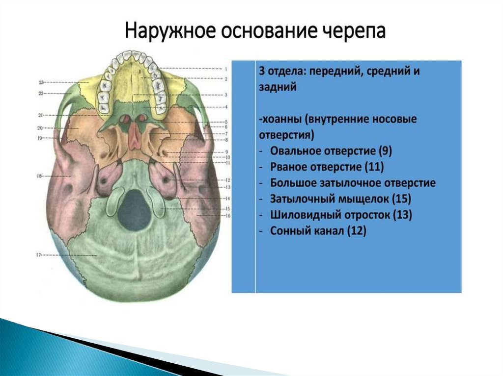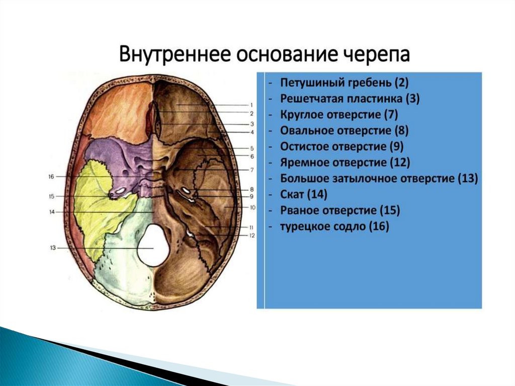 6. На внутреннем основании черепа различают переднюю, среднюю и заднюю черепные ямки: