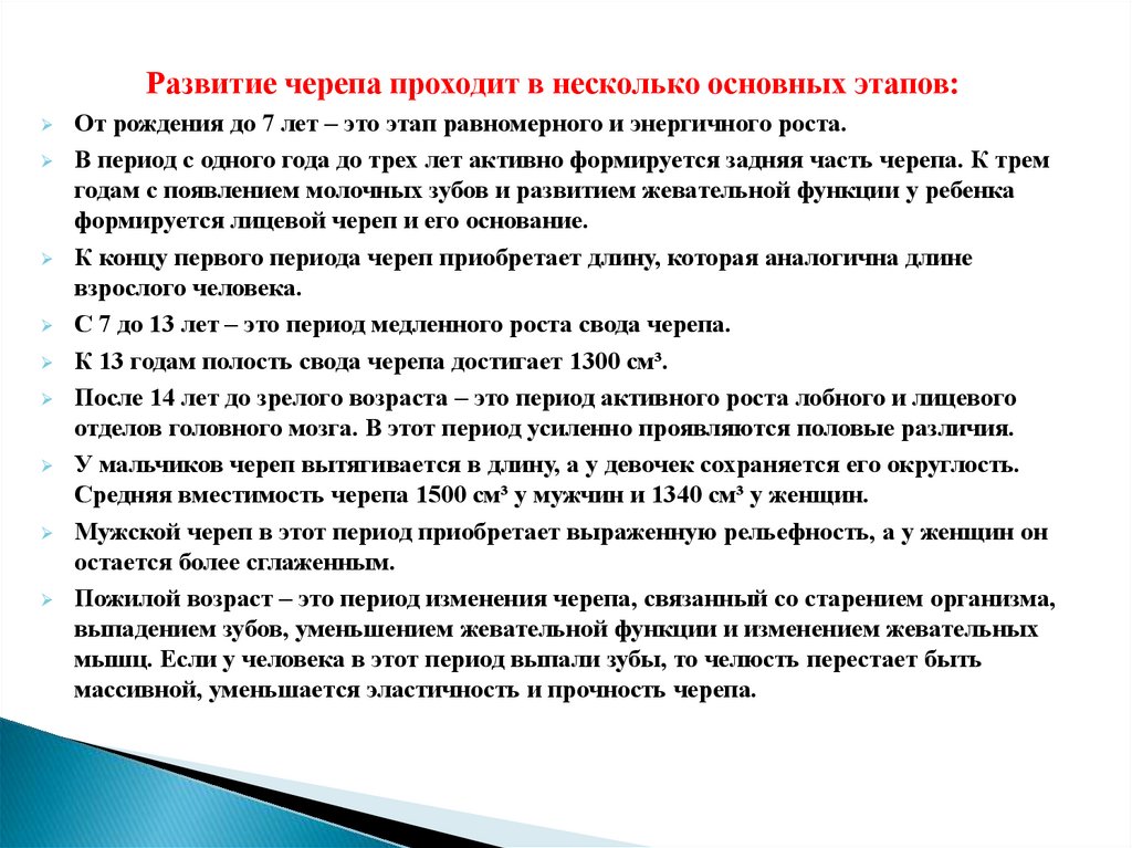Развитие черепа проходит в несколько основных этапов:От рождения до 7 лет – это этап равномерного и энергичного роста.