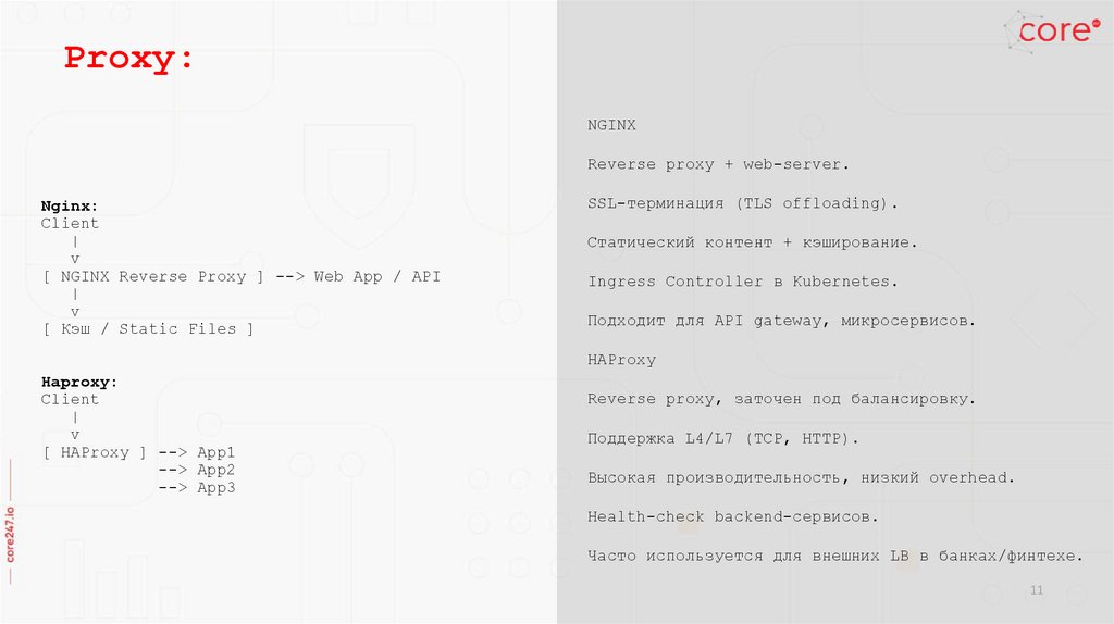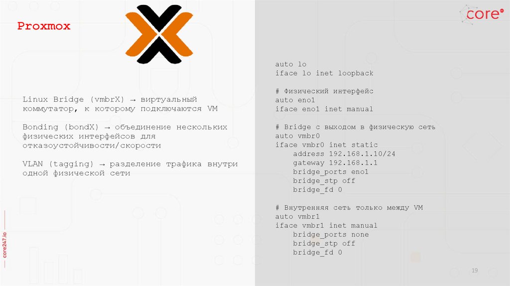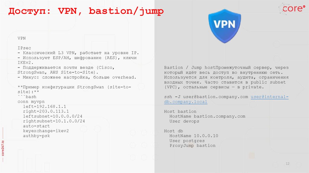 - **VLAN (802.1Q)** — L2 сегментация, тег в Ethernet-кадре, изоляция трафика (например, PROD