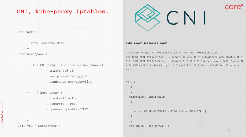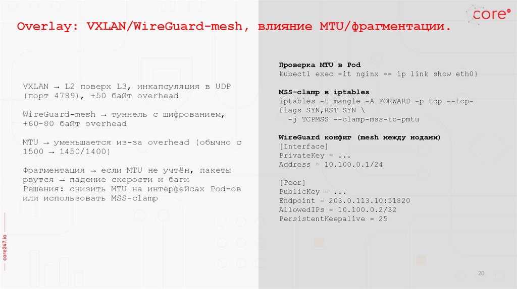 кадры в L3, поддерживает до 16 млн сегментов (VNI). Используется в Kubernetes (CNI plugins: