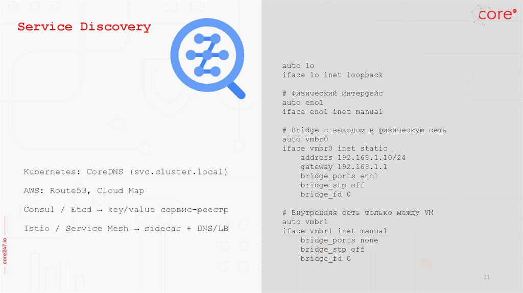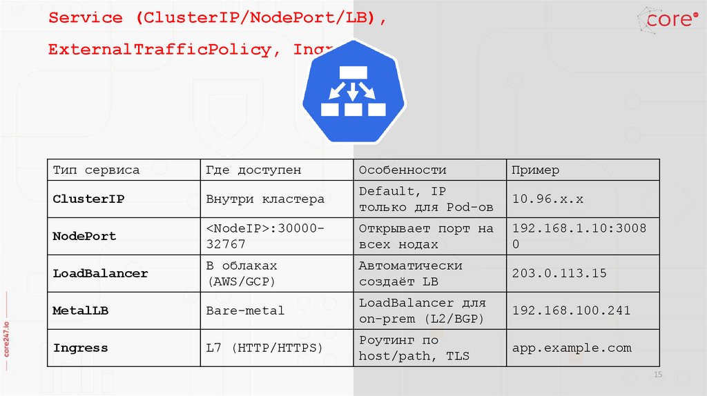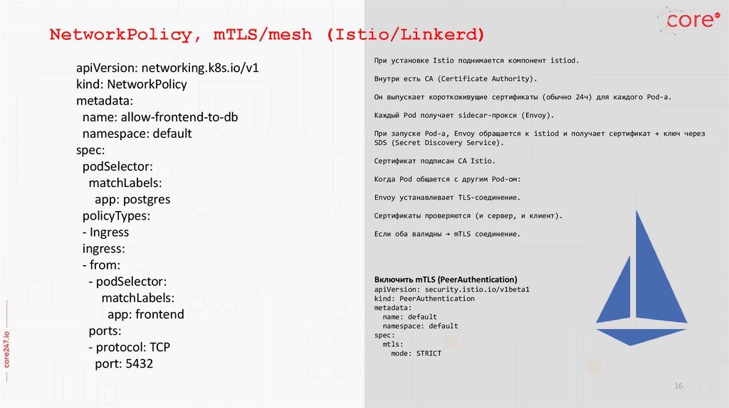 - Реализация через SDN, сервис-меш (Istio), Kubernetes NetworkPolicy.