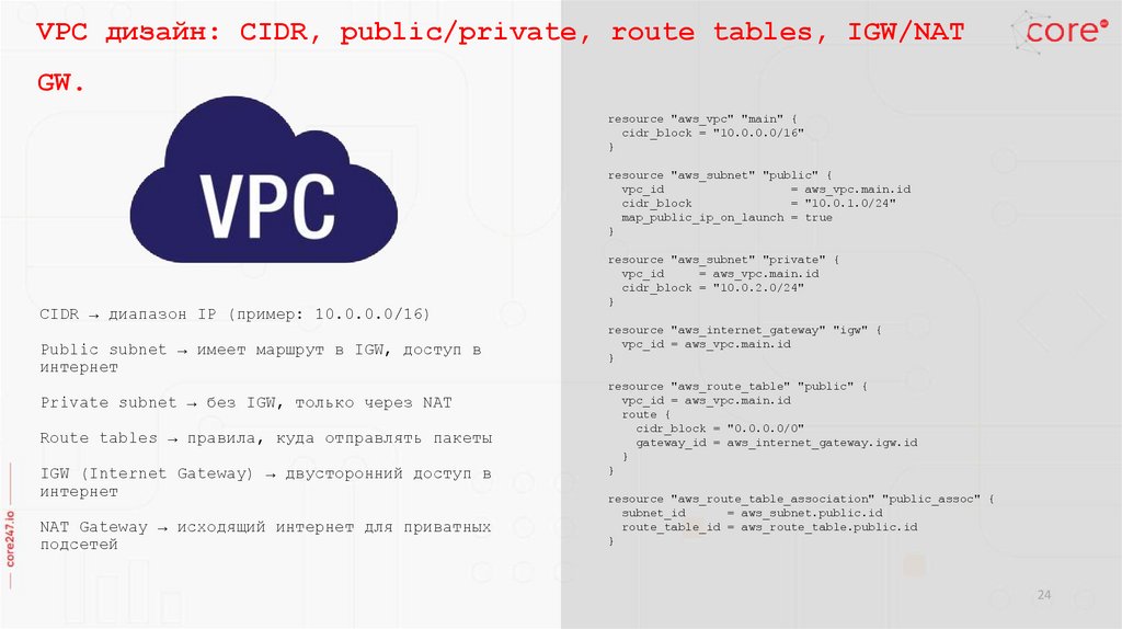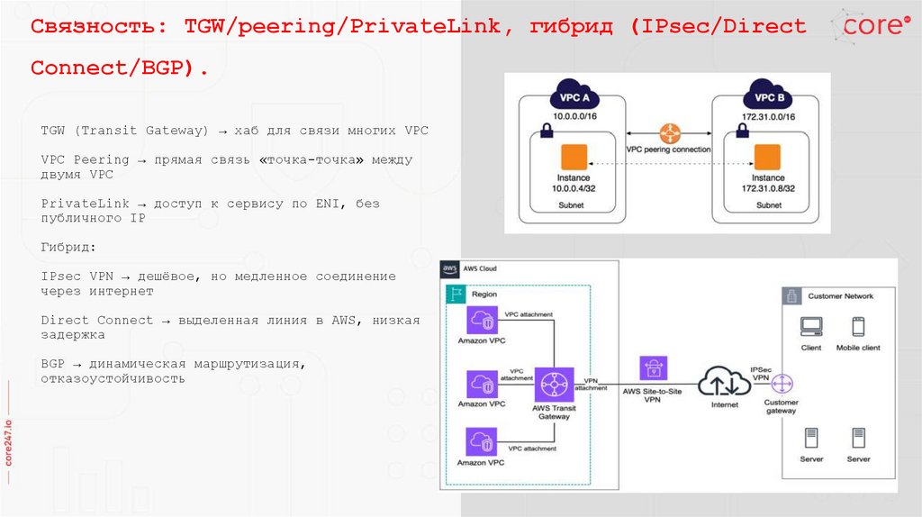 Связность: TGW/peering/PrivateLink, гибрид (IPsec/DirectConnect/BGP).