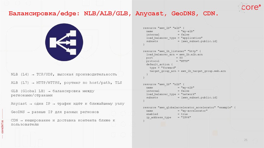 Балансировка/edge: NLB/ALB/GLB, Anycast, GeoDNS, CDN.resource "aws_lb" "alb" {