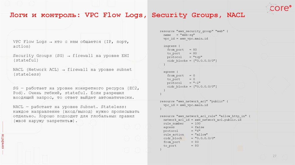 Логи и контроль: VPC Flow Logs, Security Groups, NACLVPC Flow Logs → кто с кем общается (IP, порт,