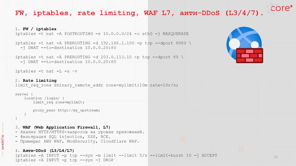 FW, iptables, rate limiting, WAF L7, анти-DDoS (L3/4/7).1. FW / iptables
