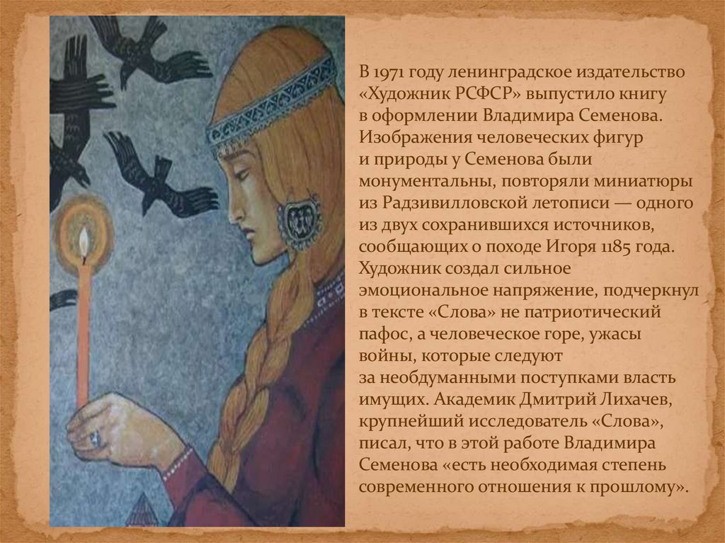 На городской стене в Путивле плачет жена ИгоряЯрославна;