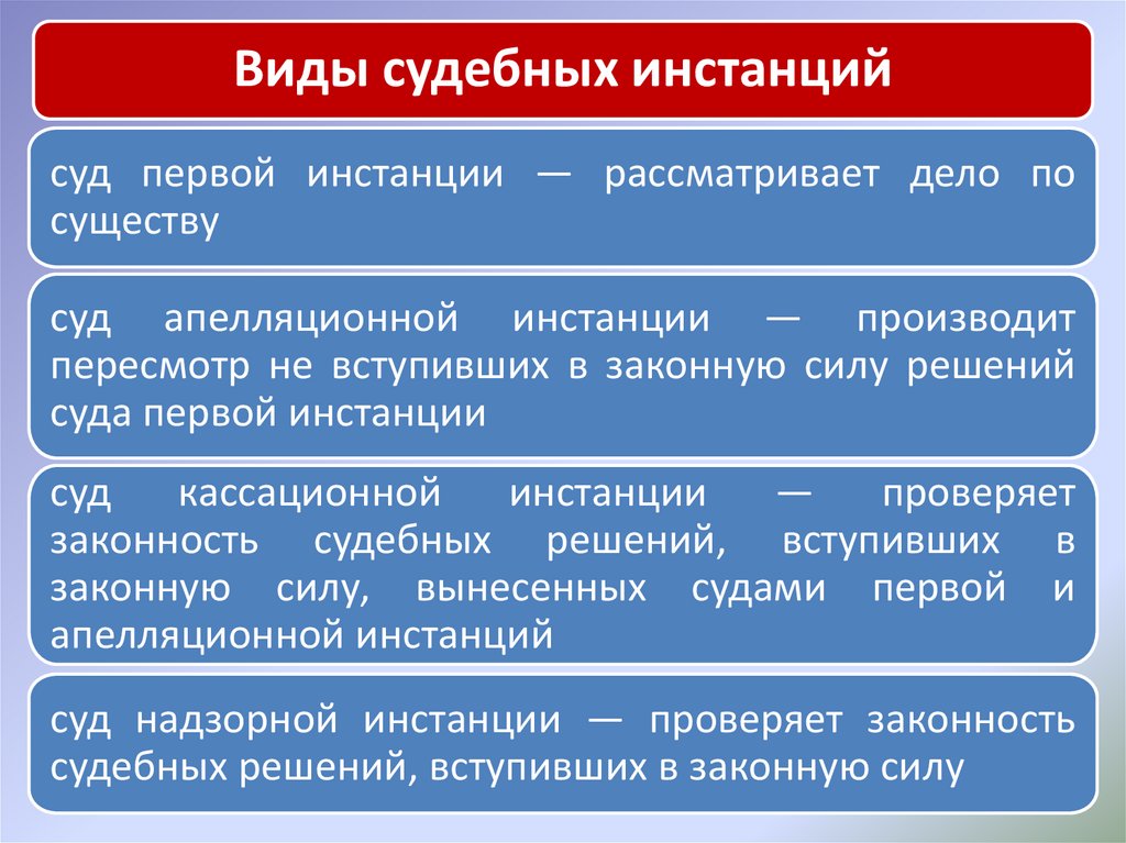 Виды судебных инстанцийсуд первой инстанции — рассматривает дело по
