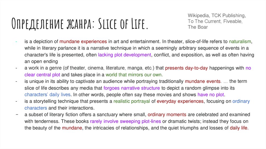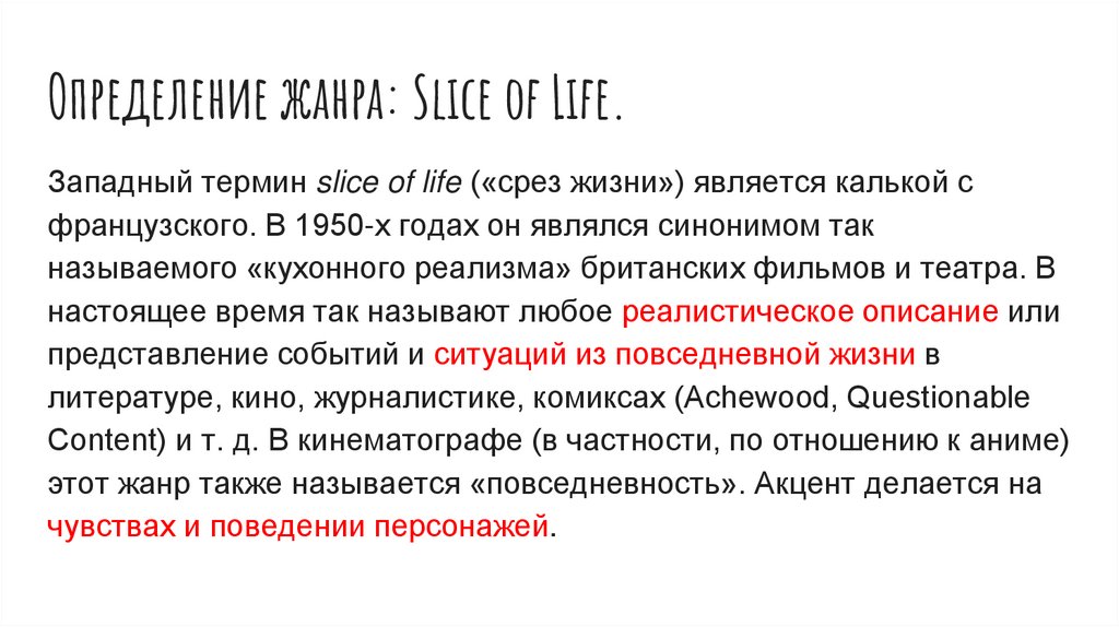 Определение жанра: Slice of Life.Западный термин slice of life («срез жизни») является калькой с