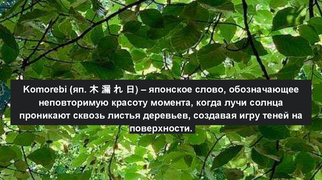 Komorebi (яп. 木 漏 れ 日) – японское слово, обозначающеенеповторимую красоту момента, когда лучи солнца
