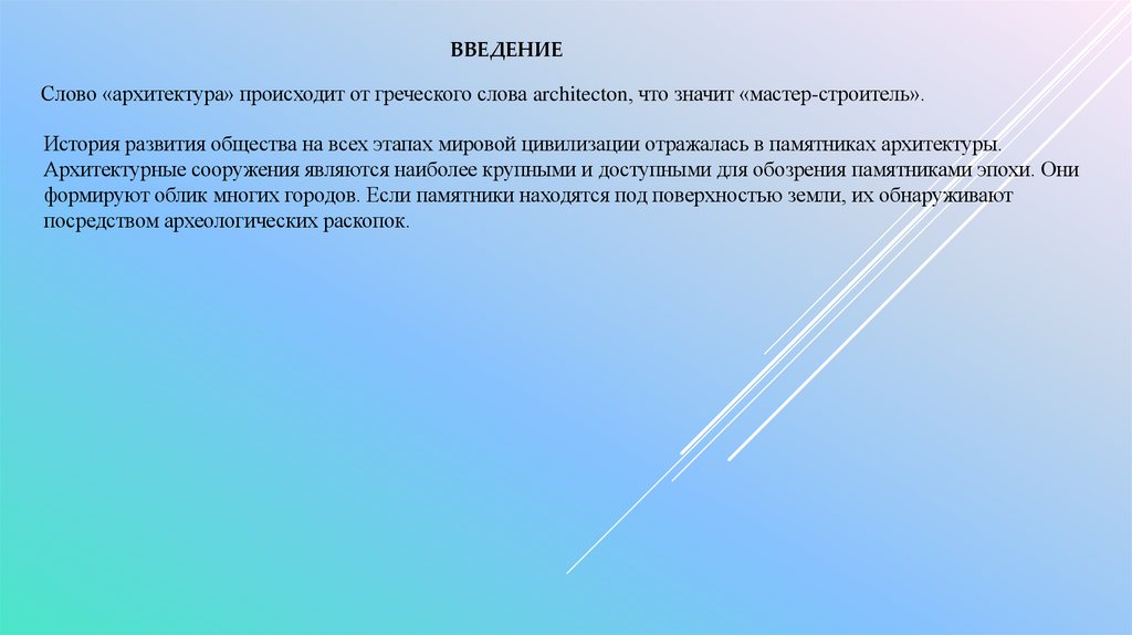 ВВЕДЕНИЕСлово «архитектура» происходит от греческого слова architecton, что значит «мастер-строитель».