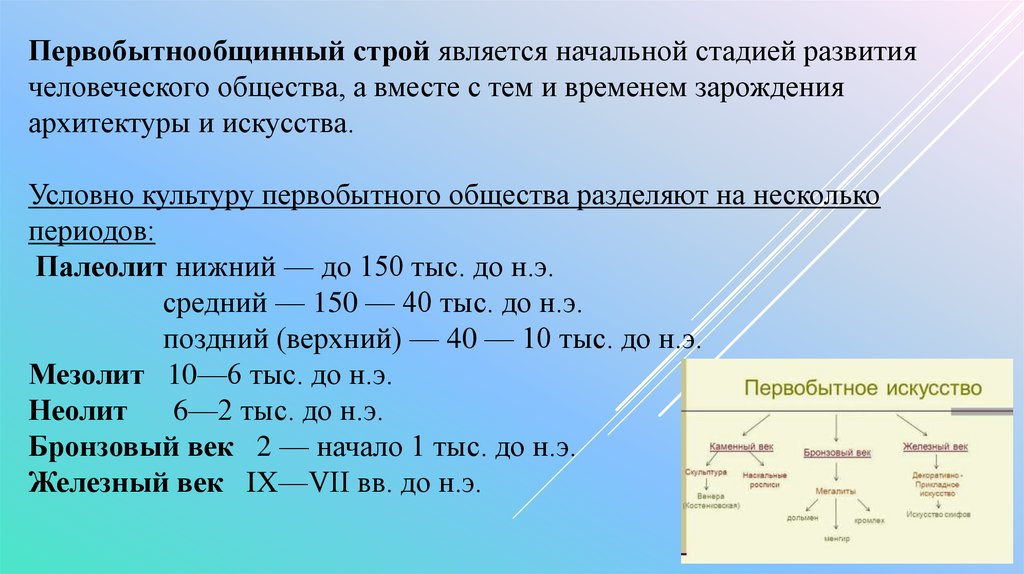 Условно культуру первобытного общества разделяют на несколько