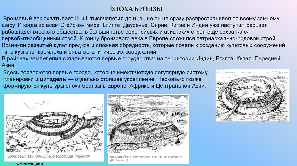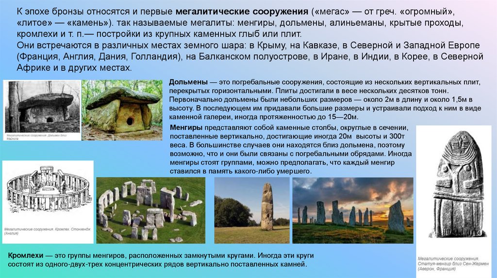 К эпохе бронзы относятся и первые мегалитические сооружения («мегас» — от греч. «огромный»,«литое» — «камень»). так называемые мегалиты: менгиры, дольмены, алиньеманы, крытые проходы,