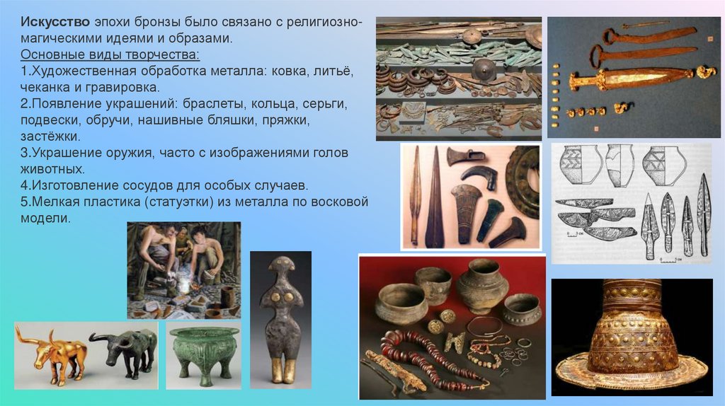 Искусство эпохи бронзы было связано с религиозномагическими идеями и образами.Основные виды творчества: