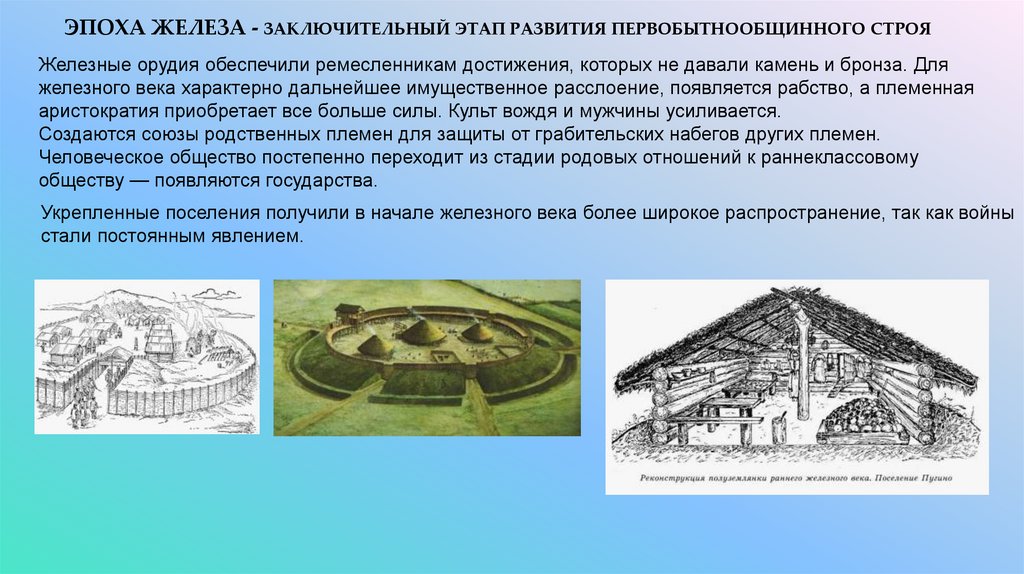 ЭПОХА ЖЕЛЕЗА - ЗАКЛЮЧИТЕЛЬНЫЙ ЭТАП РАЗВИТИЯ ПЕРВОБЫТНООБЩИННОГО СТРОЯЖелезные орудия обеспечили ремесленникам достижения, которых не давали камень и бронза. Для