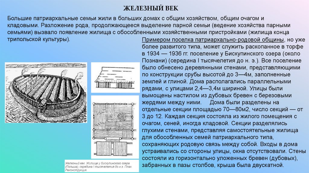 ЖЕЛЕЗНЫЙ ВЕКБольшие патриархальные семьи жили в больших домах с общим хозяйством, общим очагом и