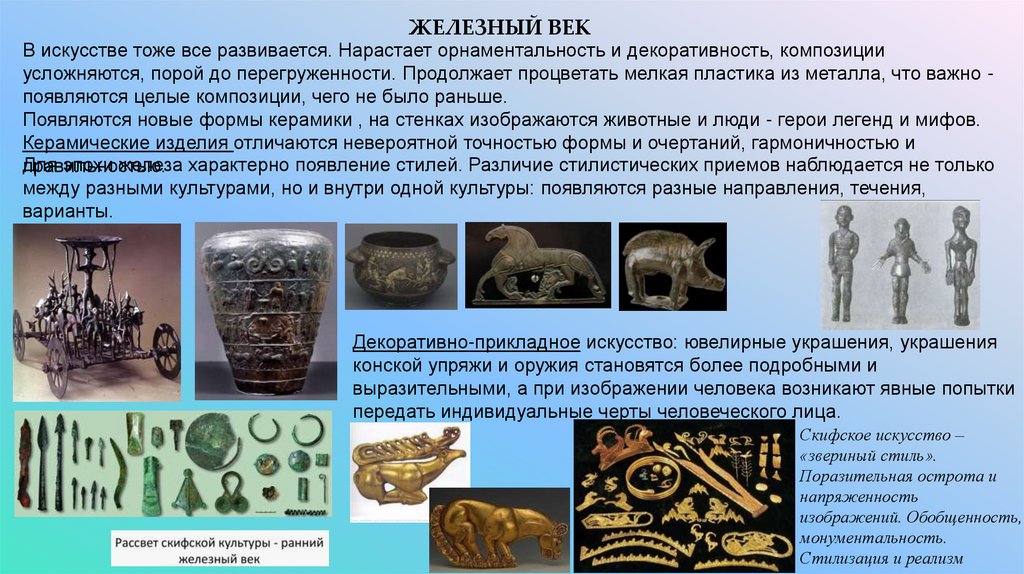 ЖЕЛЕЗНЫЙ ВЕКВ искусстве тоже все развивается. Нарастает орнаментальность и декоративность, композиции