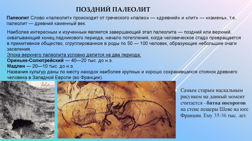 ПОЗДНИЙ ПАЛЕОЛИТПалеолит Слово «палеолит» происходит от греческого «палео» — «древний» и «лит» — «камень», т.е.