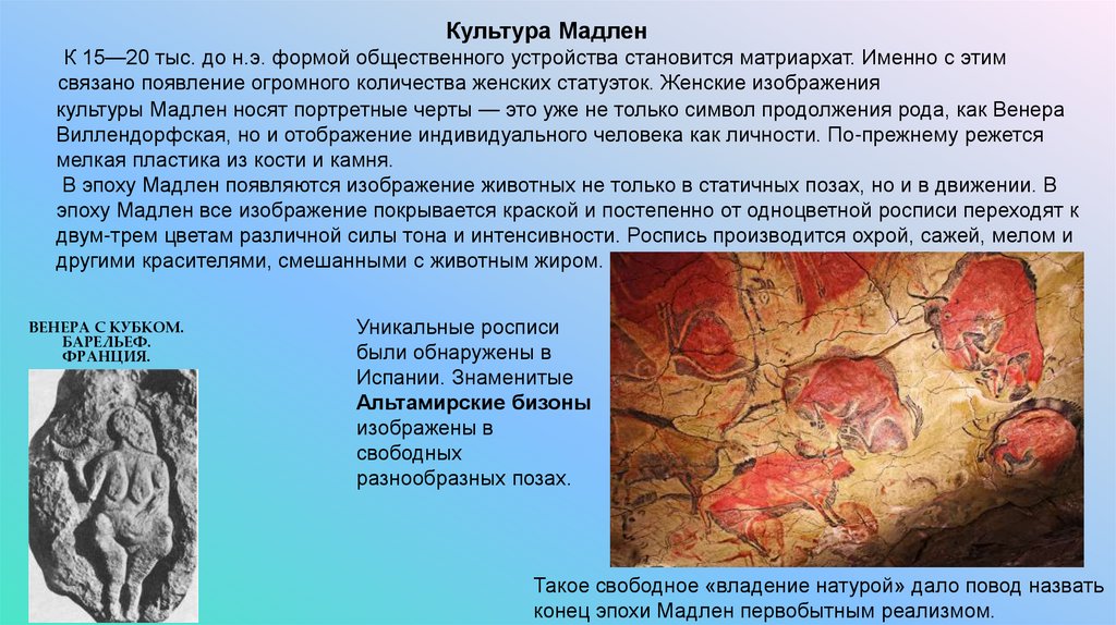 Культура МадленК 15—20 тыс. до н.э. формой общественного устройства становится матриархат. Именно с этим