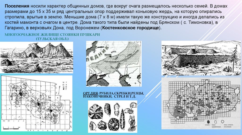 костей мамонта с очагом в центре. Дома такого типа были найдены под Брянском ( с. Тимоновка), в