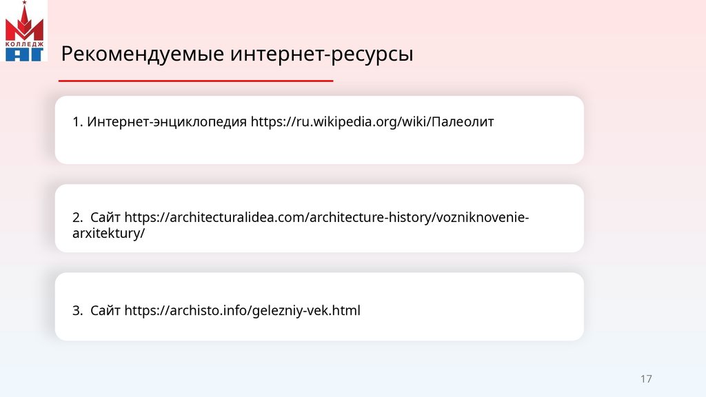 Рекомендуемые интернет-ресурсы1. Интернет-энциклопедия https://ru.wikipedia.org/wiki/Палеолит