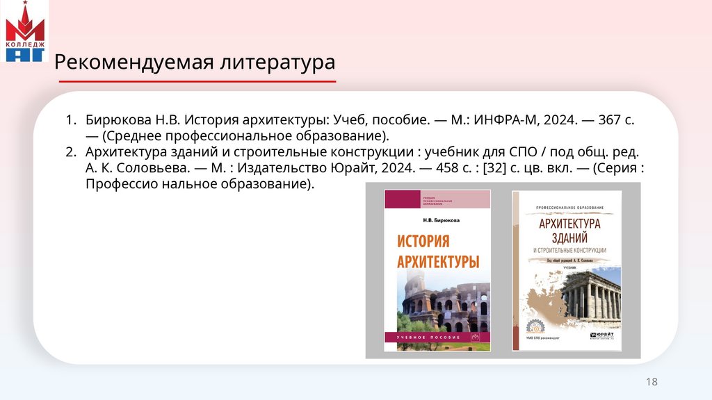 Рекомендуемая литература1. Бирюкова Н.В. История архитектуры: Учеб, пособие. — М.: ИНФРА-М, 2024. — 367 с.