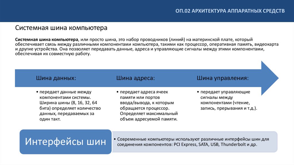 ОП.02 АРХИТЕКТУРА АППАРАТНЫХ СРЕДСТВСистемная шина компьютера