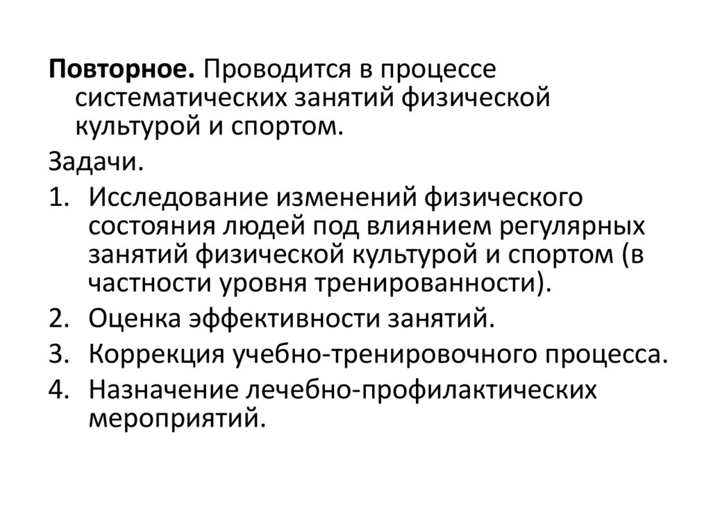 • Первичное. Проводится перед началом занятийфизической культурой и спортом, а также в начале