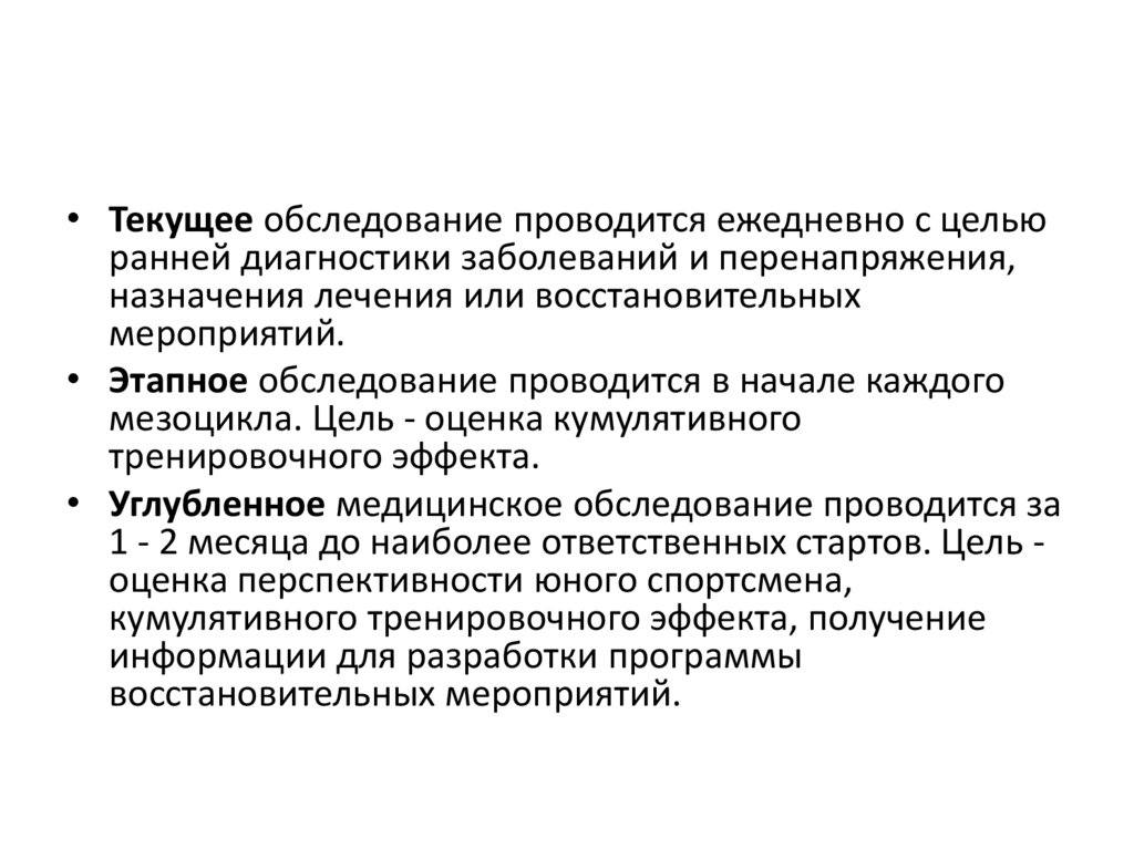 • Текущее обследование проводится ежедневно с цельюранней диагностики заболеваний и перенапряжения,