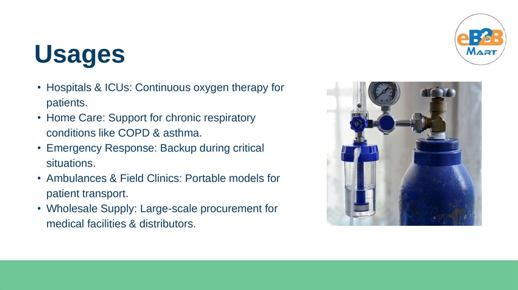 Usages• Hospitals & ICUs: Continuous oxygen therapy for