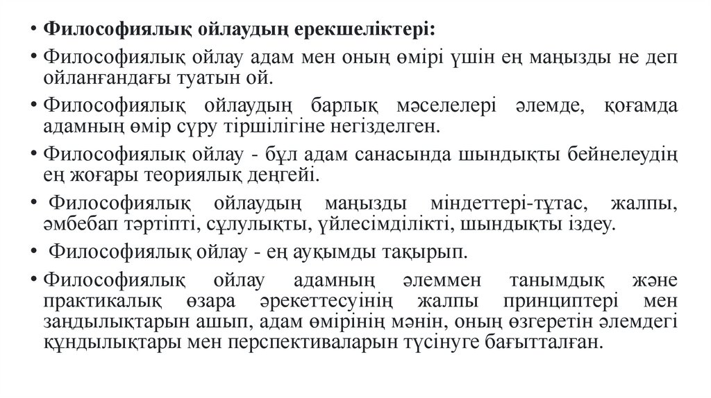 • Философиялық ойлаудың ерекшеліктері:• Философиялық ойлау адам мен оның өмірі үшін ең маңызды не деп