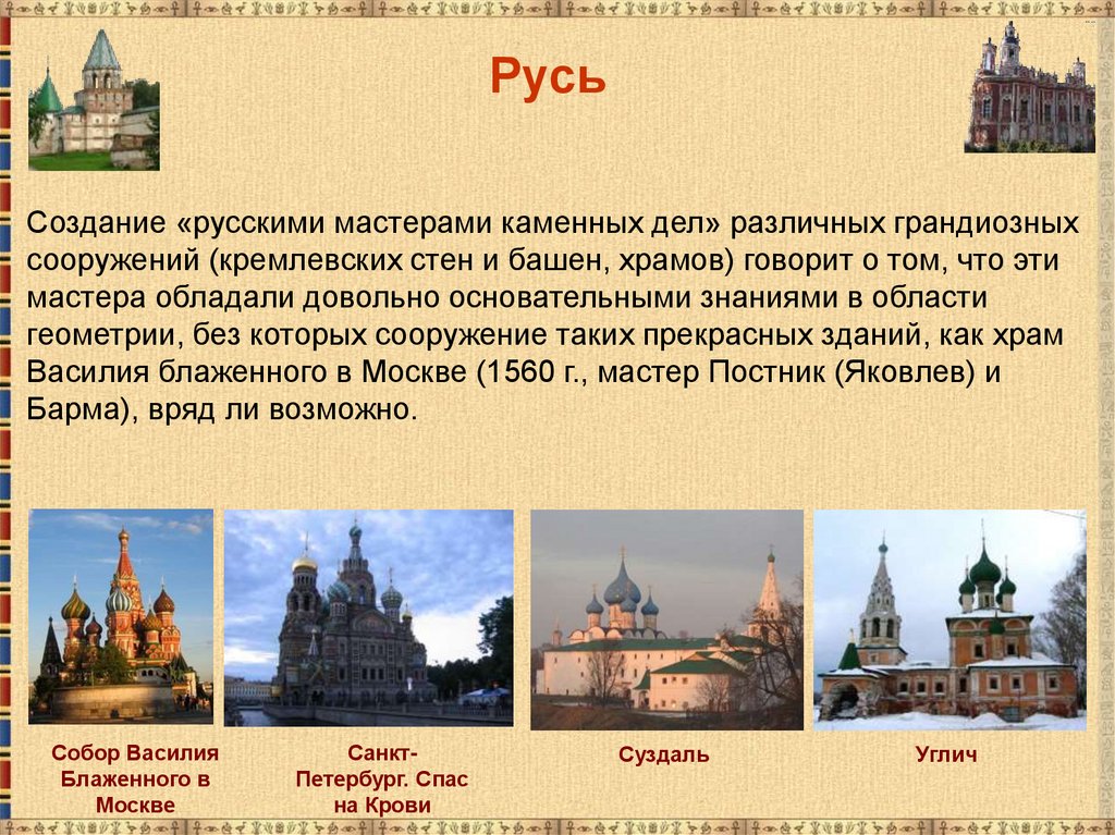 РусьСоздание «русскими мастерами каменных дел» различных грандиозных