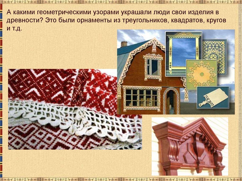 А какими геометрическими узорами украшали люди свои изделия вдревности? Это были орнаменты из треугольников, квадратов, кругов