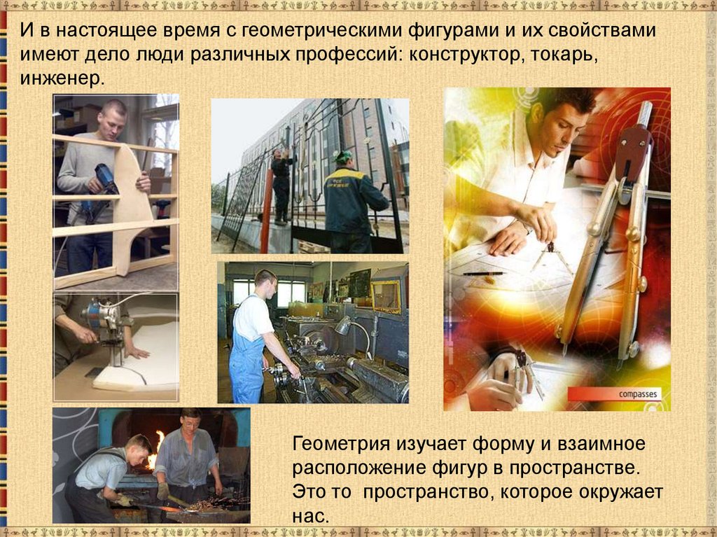 И в настоящее время с геометрическими фигурами и их свойствамиимеют дело люди различных профессий: конструктор, токарь,