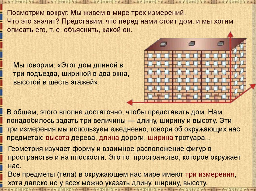Посмотрим вокруг. Мы живем в мире трех измерений.Что это значит? Представим, что перед нами стоит дом, и мы хотим