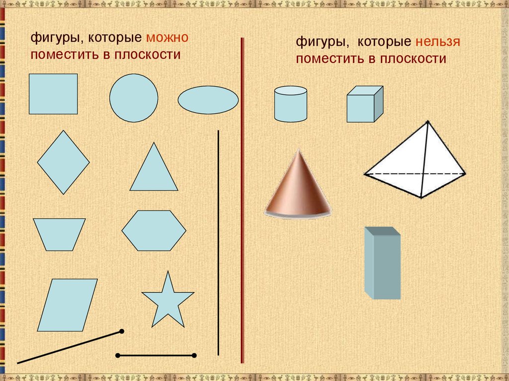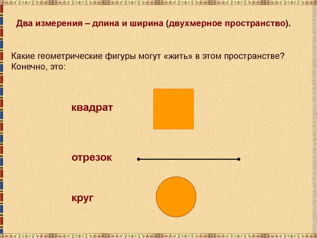 Два измерения – длина и ширина (двухмерное пространство).Какие геометрические фигуры могут «жить» в этом пространстве?
