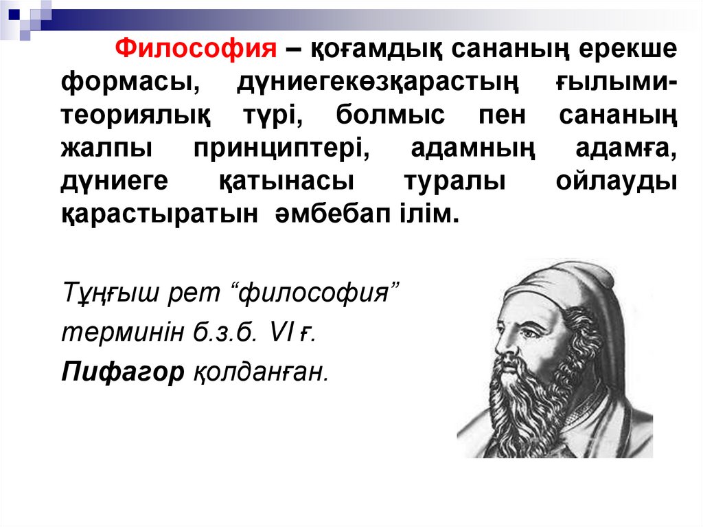 Философия – қоғамдық сананың ерекшеформасы, дүниегекөзқарастың ғылымитеориялық түрі, болмыс пен сананың
