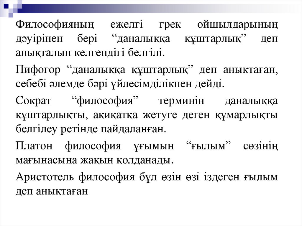 Философияның ежелгi грек ойшылдарыныңдәуiрiнен берi “даналыққа құштарлық” деп