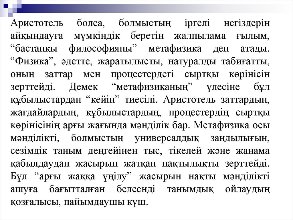 Аристотель болса, болмыстың iргелi негiздерiнайқындауға мүмкiндiк беретiн жалпылама ғылым,