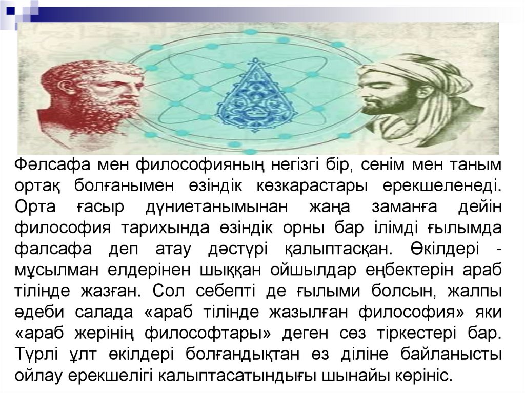 фалсафа деп атау дәстүрі қалыптасқан. Өкілдері мұсылман елдерінен шыққан ойшылдар еңбектерін араб